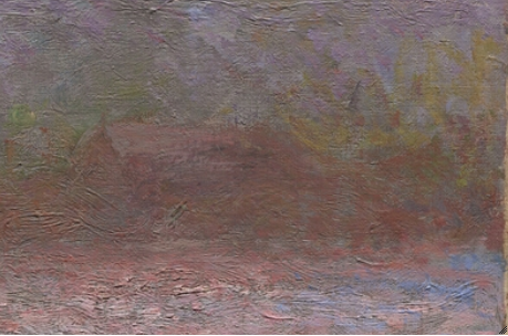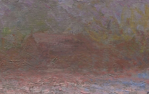 Photomicrograph of a building in Monet’s Stack of Wheat (Thaw, Sunset) (1890/91) showing traces of old retouching. The Art Institute of Chicago, 1983.166