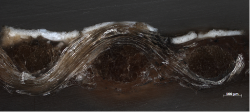 Photomicrograph of the edge of Monet’s Stack of Wheat (Thaw, Sunset) (1890/91) showing an old restoration fill. The Art Institute of Chicago, 1983.166.