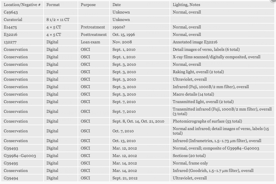 The image inventory compiles records of all known images of the artwork on file in the Conservation Department, the Imaging Department, and the Department of Medieval to Modern European Painting and Sculpture at the Art Institute of Chicago (fig. 15.69).